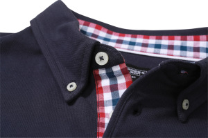 - Combed Cotton - Fine classic piqué fabric - Button-down polo shirt with fashionable check inset - Check trimming on collar band, inside of button placket and side slits - 3 buttons in contrasting colour, half-moon in matching colour - This product can be printed and embroidered too.