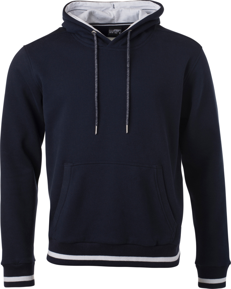 2-layer hood inside in contrasting colour, contrasting stripes on waistband and sleeve cuffs, knitted cuffs with elastane, kangaroo pocket, roughened inside. This product can be printed and embroidered too.