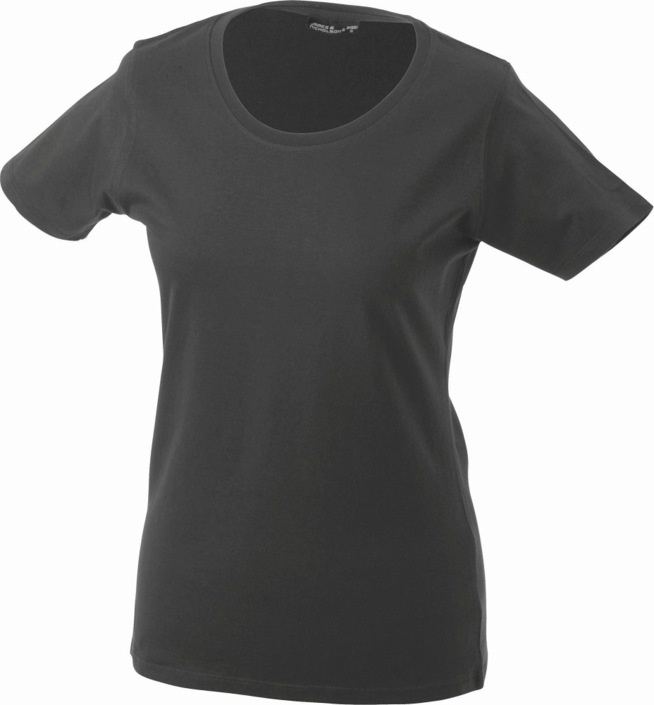 - Ringspun cotton - Ladies' T-shirt with round neckline - Single-jersey - Fine knitted bands on neckline - Necktape - Slightly waisted with side stitching - Twin-needle stitching on shoulders, neckline and armline - This product can be printed and embroidered too.