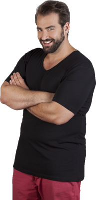 T-shirt, V-neck, single jersey. cut: – fitted workmanship: – neck binding – back neck tape – shoulder seams with stay tape – double seams properties:– combed cotton – soft hand feel – elastane for better comfort Sizes of 4XL and 5XL are available on enquiry. This product can be printed and embroidered too.